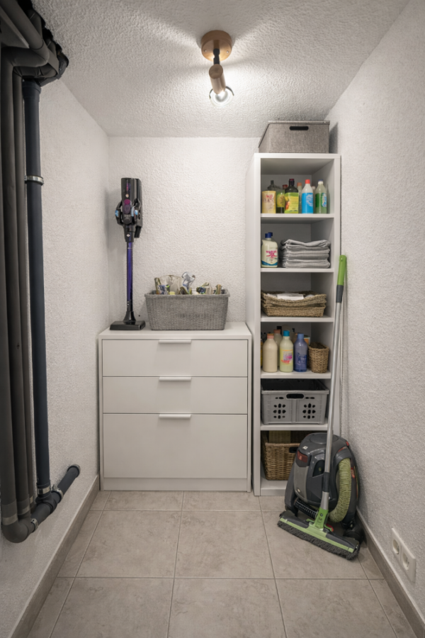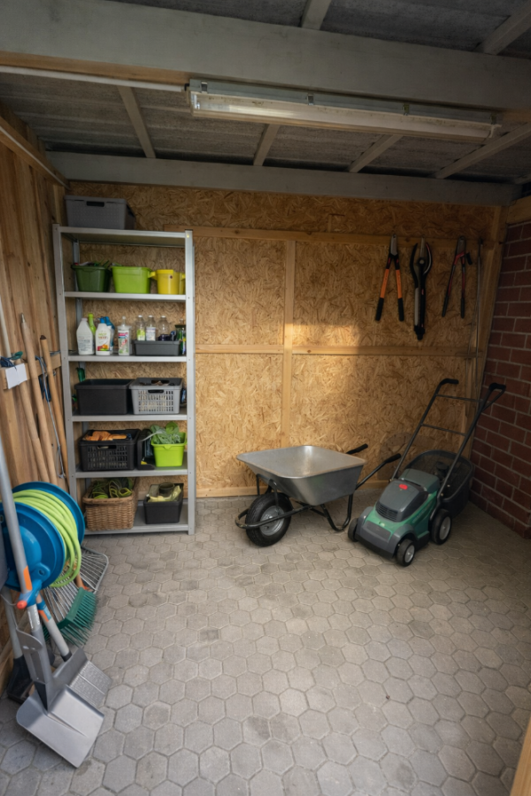 Zusätzlich steht innerhalb der Wohnung ein praktischer Abstellraum zur Verfügung. Darüber hinaus bietet ein kleiner Spitzboden über dem Wohnzimmer weitere Staufläche. Ein weiterer, großzügiger Abstellraum im Außenbereich in Form eines separaten Holz- bzw. Geräteschuppens sorgt für zusätzlichen Stauraum.
